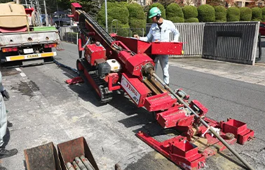 想定外の地中埋設物や、地層に遭遇した時、ドリルヘッドを数メートル手前にバックさせ、障害物を迂回するラインをすばやく再削孔することが可能です。また、機械は地上設置を基本とし、作業スペースを小さくスピーディーに施工することができるため、日々の機械据付撤去も容易です。