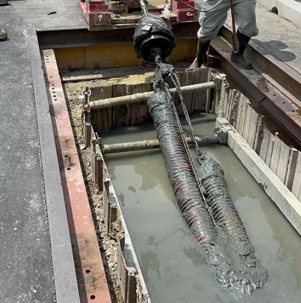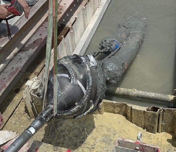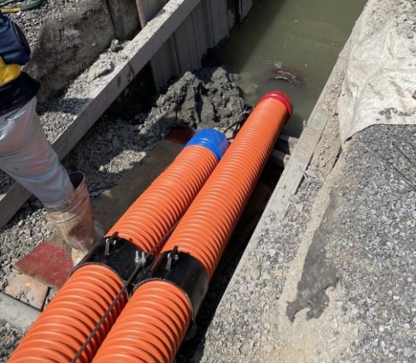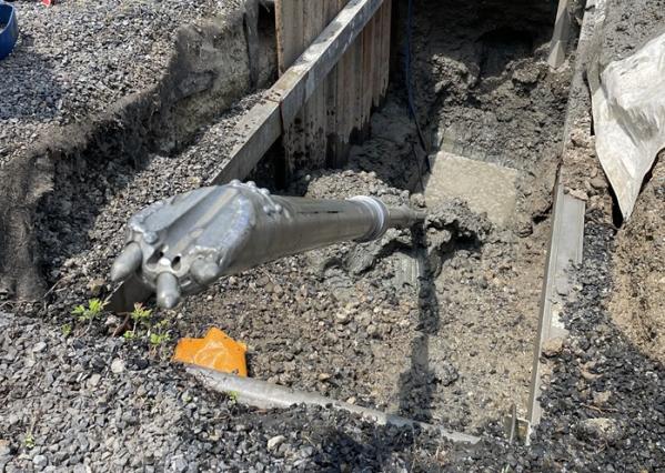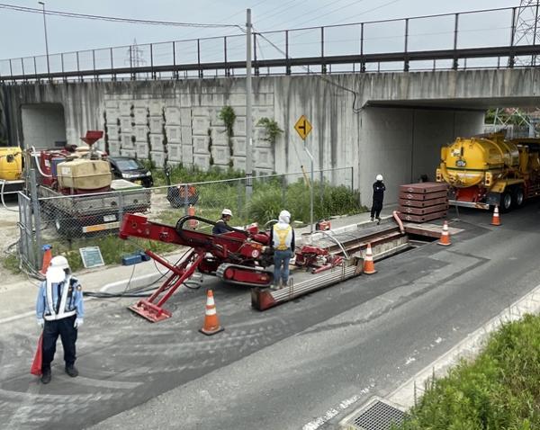 - 今回の埋設管計画は、管径:φ150mm、管種:FSSP管(鋼帯入波付管)、2条をボックスカルバートと道路擁壁の下部(伏越し)に非開削工法にて埋設施工するものです。HDD工法は、推進工法に必要な立坑工及び薬液注入工が不要で、工程を削減でき工期を大幅に短縮できる。また到達坑側は鉄塔敷地内にある為、作業制限(上空制限)が設けられており、推進工法に必要な立坑(鋼管及び矢板立坑)の設置が困難で、簡易立坑から発進・到達が可能なHDD工法が採用されました。ボックスカルバート下部の地盤改良部の先行削孔には、硬質地盤用ドリルヘッドをご提案し採用に至りました。
